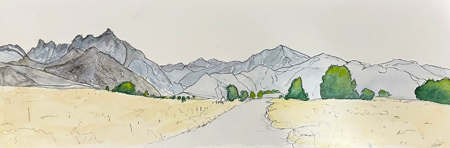 This is the start of a painting of the eastern side of the mountains as seen from the high desert. The spot is a short drive from Mammoth Lakes.